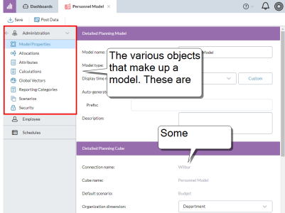 The other elements that make up a detailed planning model (allocations, attributes, calculations, and so on, appear below Model Properties: