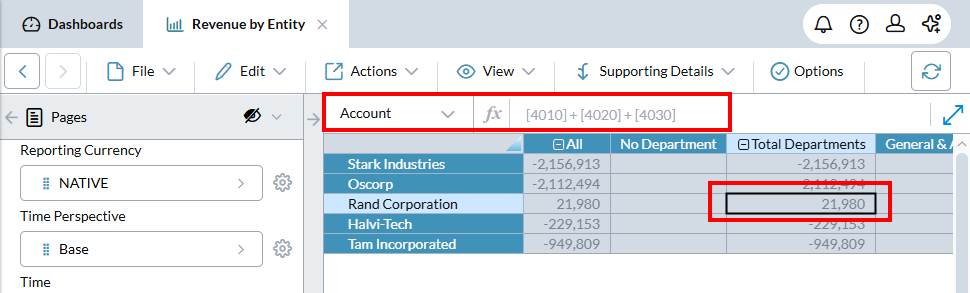 The Formula Bar shows whether the currently selected cell's value was input, imported, or derived from a calculation, and you can inspect how a number was derived, including which accounts, versions, and rule sets contributed to it: