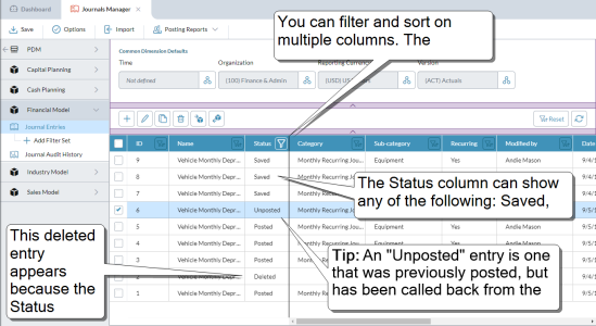 By default journal entries with the Status of Deleted do not appear in the journal entries list. However, you can use the filter to show them.