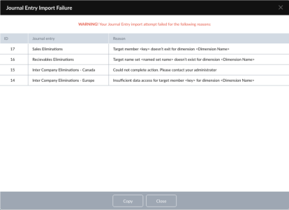 If any entries fail to post, a dialog opens listing those entries and what went wrong with each.