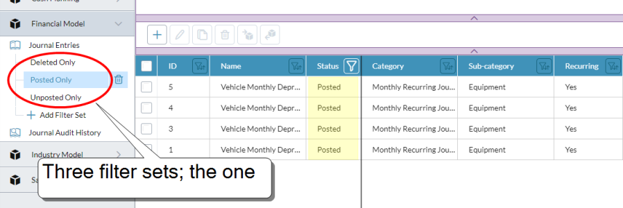 All your filter sets appear in the side drawer, in a tree beneath Journal Entries: