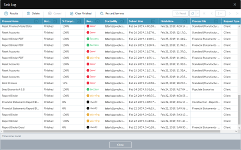 The Task Log shows the status of all running or completed processes. The log lists 100 processes per page, starting with the most recent.