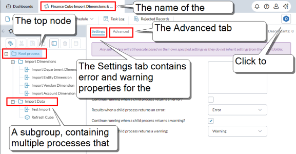 Within a process group, the processes run in sequential order, from top to bottom. An error or warning raised by a single process can affect whether the remaining processes run. You can use the root folder to define how the entire process group handles errors and warnings. You can also use other folders to do the same for subgroups.