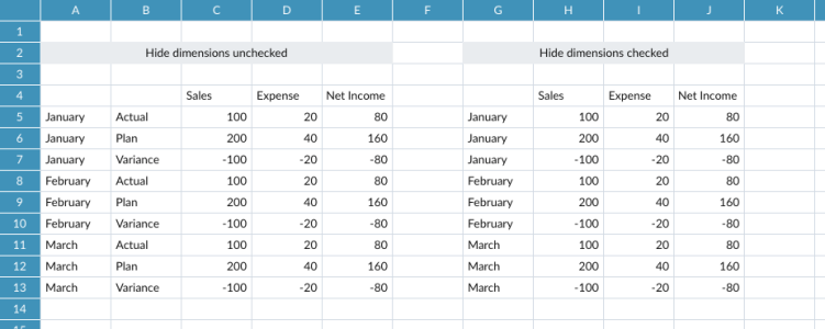 Example:  A data view with Hide dimension turned off and with it turned on: