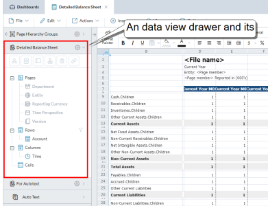 A drawer lists the components that make up the data view (the Pages, Rows, Columns, and Cells) as well as the page hierarchies that they contain.