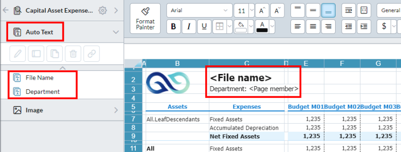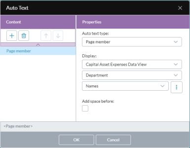 When an end user opens the template for data entry or as a report, the Auto Text elements can show, for example, the template name, the current date, or the currently selected page member.