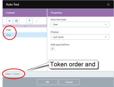 Example: The template below contains two Auto Text elements, listed in the Auto Text drawer, with their tokens in the template also visible:
