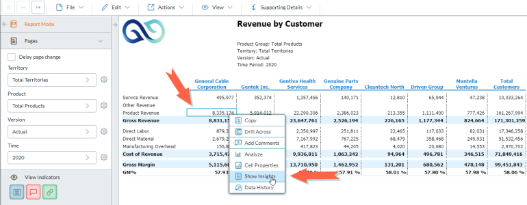 In a template in report or data-entry mode, select a value cell and select Actions > Show Insights.