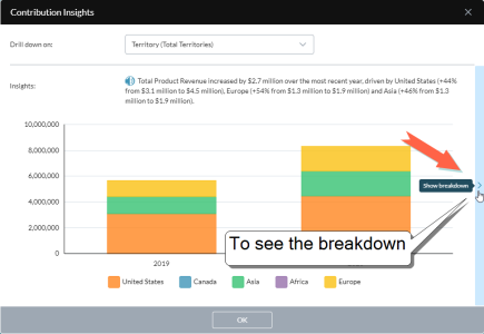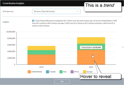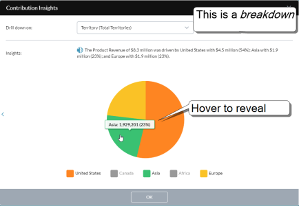 When you see a value in a report and want to understand the factors driving it, you can call up a contribution insight—a mini report that contains a narrative summary along with a chart. (Contribution Insights are similar to Chart Insights.)
